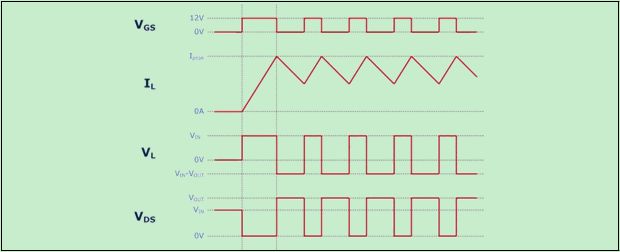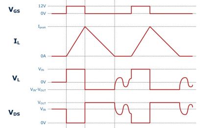 非連續導通模式的特征是,在下一個開關周期開始之前,電感電流保持為零一段時間。非連續導通模式的實現通常采用恒頻開關和較小占空比,并且一般而言,下一個開關周期不以任何方式與漏源電壓(VDS)振蕩同步。