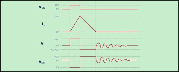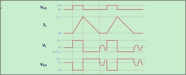 在升壓轉換器中,當電感電流到達零時,輸出二極管變為反向偏置。這可防止當輸出電壓高于輸入電壓時,電流在反方向上流動。此時,VDS恢復穩定狀態,即到達輸入電壓。受MOSFET中的寄生電容和來自磁性組件的電感的影響,VDS在到達穩定狀態之前表現出欠阻尼振蕩。