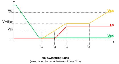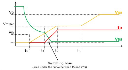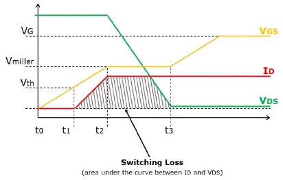 鉗位感性負載應用(如升壓轉換器)中用作開關元件并在連續導通模式下運行時,其導通和關斷開關過程并非瞬時完成。有一個短暫瞬間,其VDS和ID相互重疊。這是開關損耗的主要源頭,它在很大程度上受MOSFET寄生電容的影響。