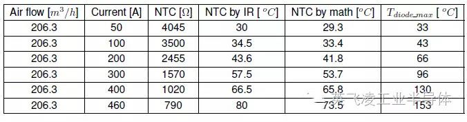 被測器件是英飛凌公司的一款PrimePACK模塊FF1000R17IE4(1000A/1700V),固定在風冷散熱器上并且冷卻風速可調。通過測量保證散熱器風量和實際系統的工況相同。芯片的溫度用紅外熱成像儀測量(IR-Camera),芯片下方的基板殼溫用貼在基板上的熱電偶測量。NTC電阻值通過數據采集器記錄并且根據IGBT模塊數據手冊中的電阻-溫度曲線將電阻值轉換成對應的溫度值,同時用紅外熱成像儀直接測量NTC電阻的溫度。被測器件通過低壓直流源供電,當大電流通過芯片時,在芯片上產生壓降和損耗,從而為芯片加熱。圖1中的右圖是被測器件的熱成像圖,通過調節直流源的輸出電流,可以改變芯片的加熱功率,進而得到不同發熱功率下的芯片溫度。待芯片溫度穩定后,記錄數據采集器和熱成像儀的測量結果,如表1所示: