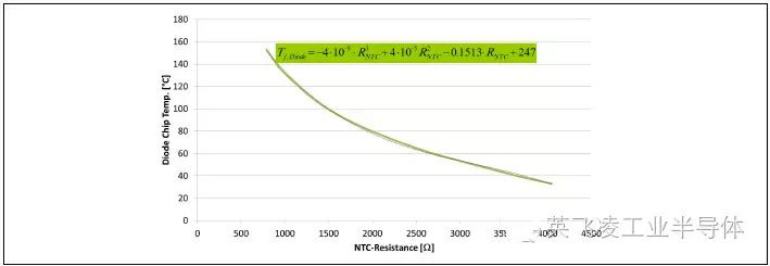 借助數據處理工具,比如Excel,對測量的NTC電阻[Ω]和二極管溫度[℃]進行校正,便可得到兩者的對應關系tdiode=f(RNTC),見圖2,其中還包括相應的多項式插值公式。